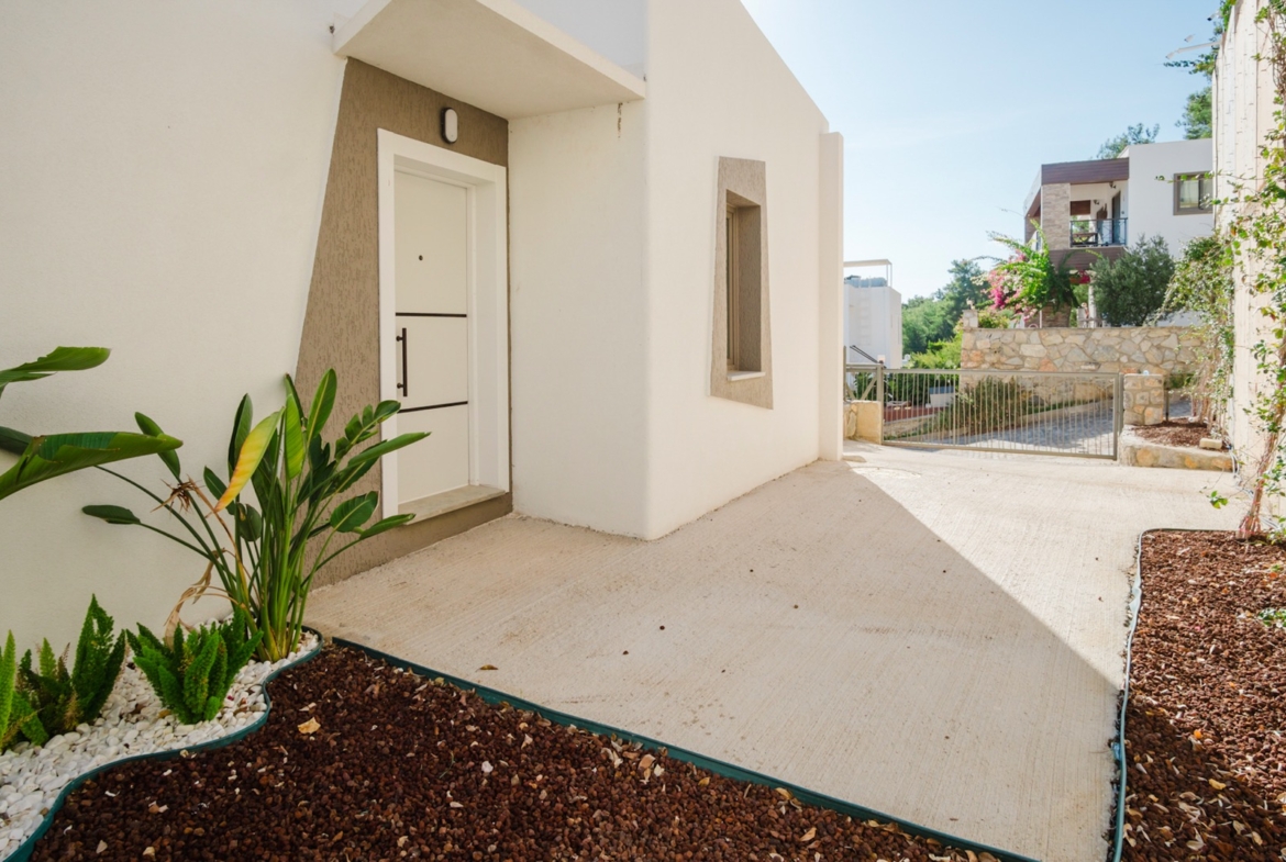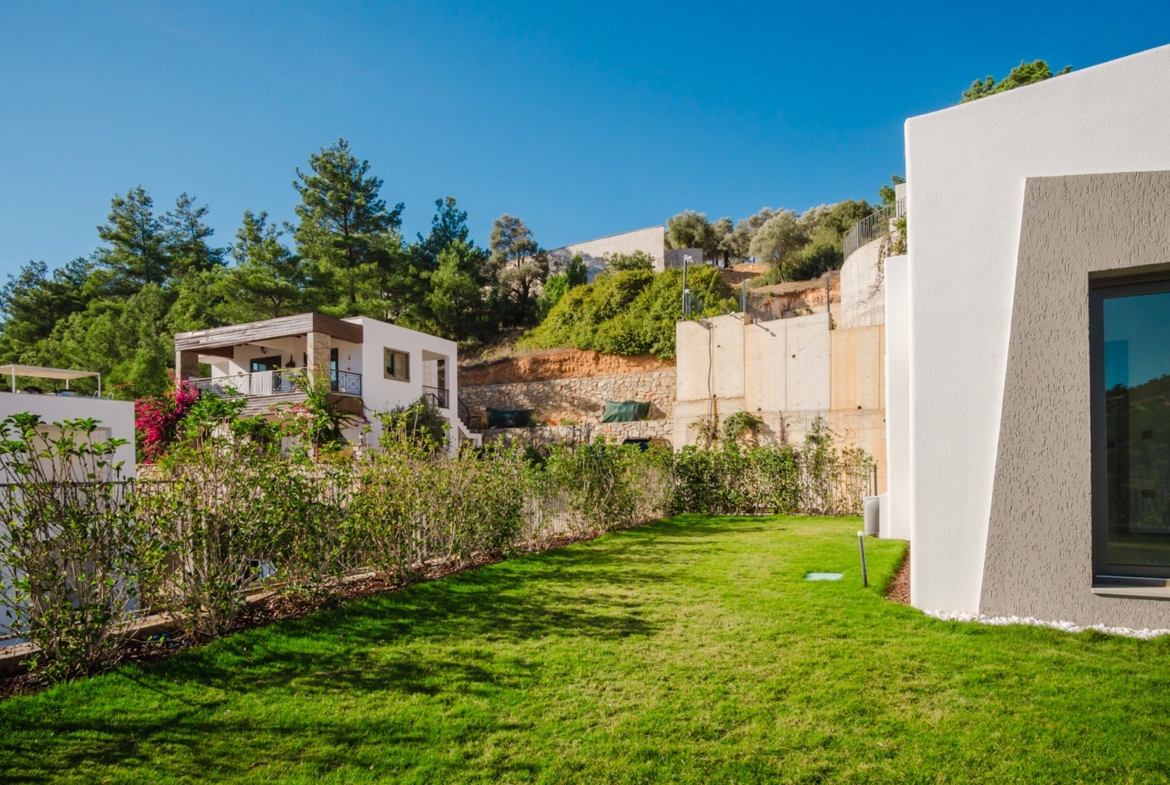 • Beyaz taş detaylar, düzenli peyzaj ve Bodrum ruhuna uygun